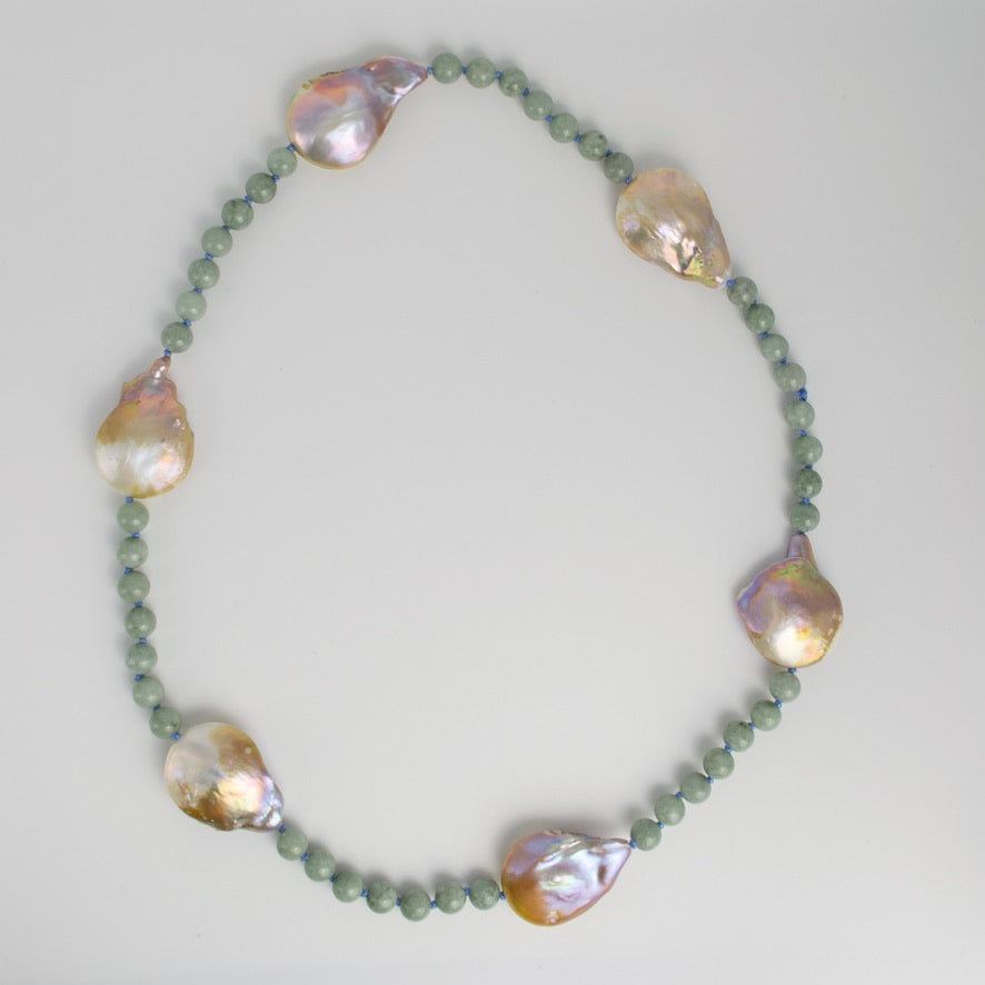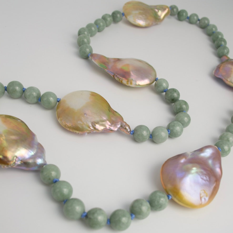 Made with luminous baroque pearls and cool-toned jade, each bead is hand-knotted on lilac silk. The contrast between the organic pearls and the gentle green jade gives the necklace its rhythm and movement, while the silk adds a subtle wash of colour when worn.