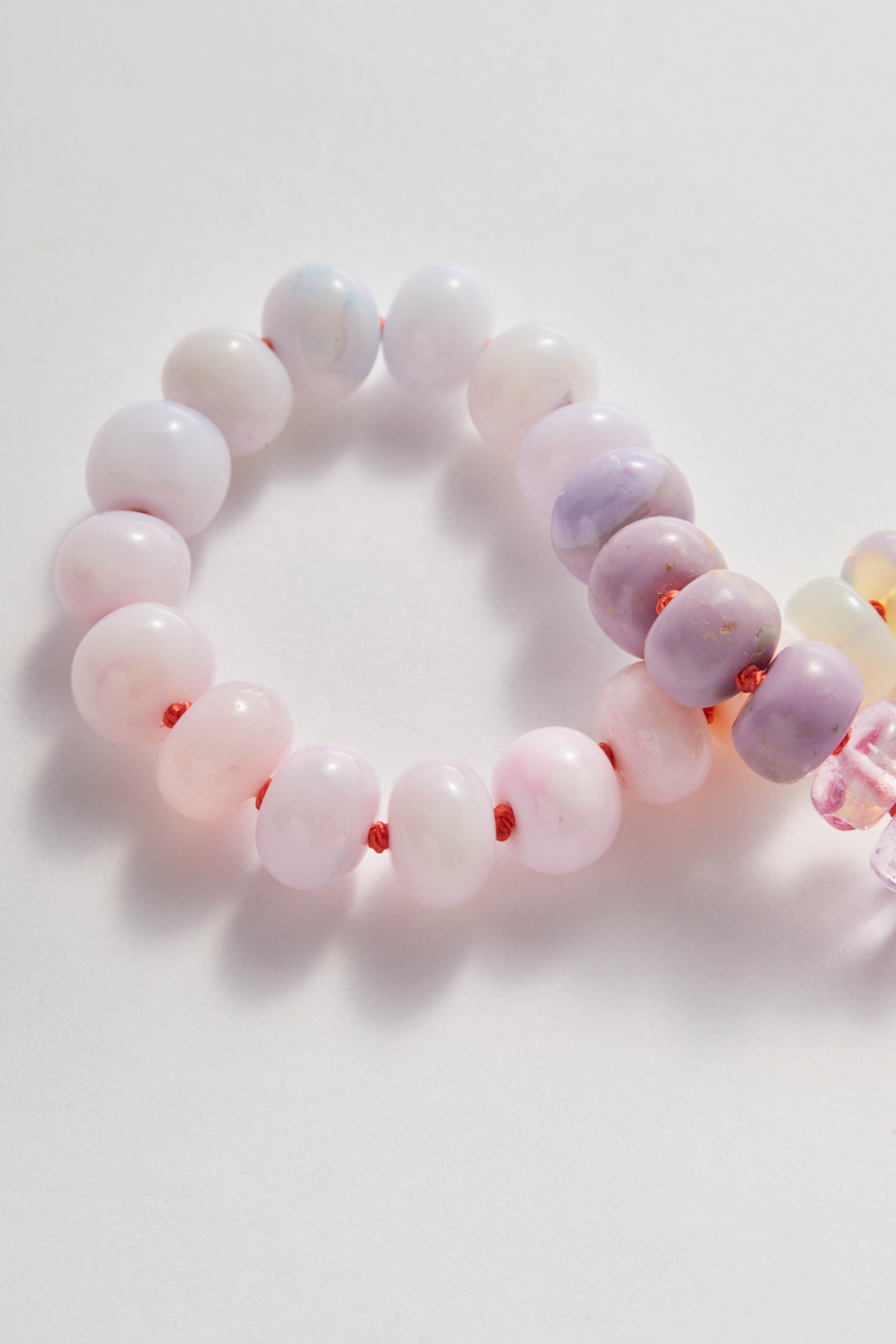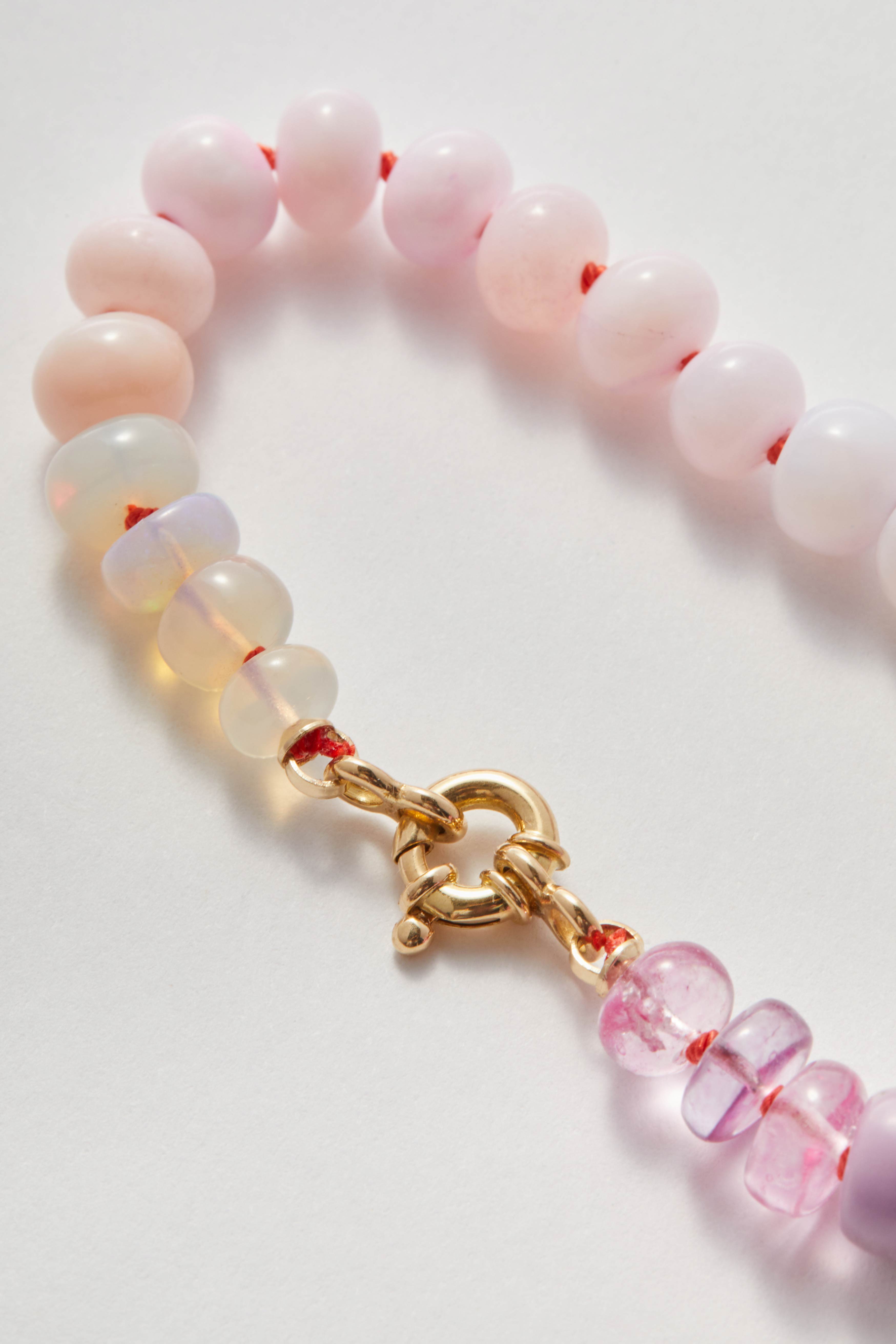 This bracelet is crafted from a soft, blush-toned palette of gemstones, moving gently between milky whites, petal pinks and translucent washes of light. The overall effect is fresh and luminous, with colour that feels easy and wearable rather than overly styled.