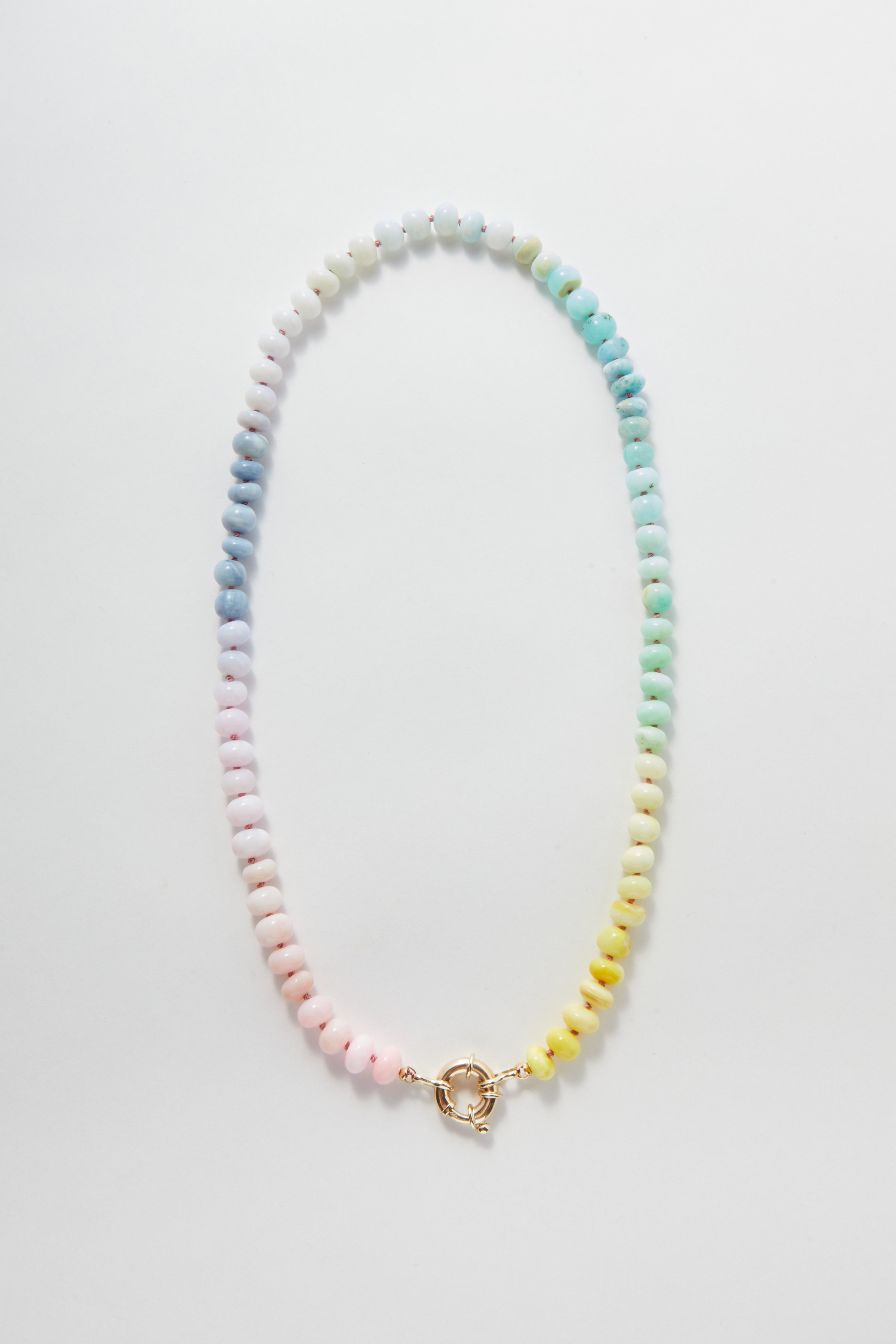 This necklace is crafted from a joyful mix of opals, each stone chosen for its colour and character. Hand-knotted onto silk thread and finished with our signature jumbo 9k gold bolt clasp, it’s designed to feel both playful and refined - a piece you’ll reach for daily, whether worn alone or layered.