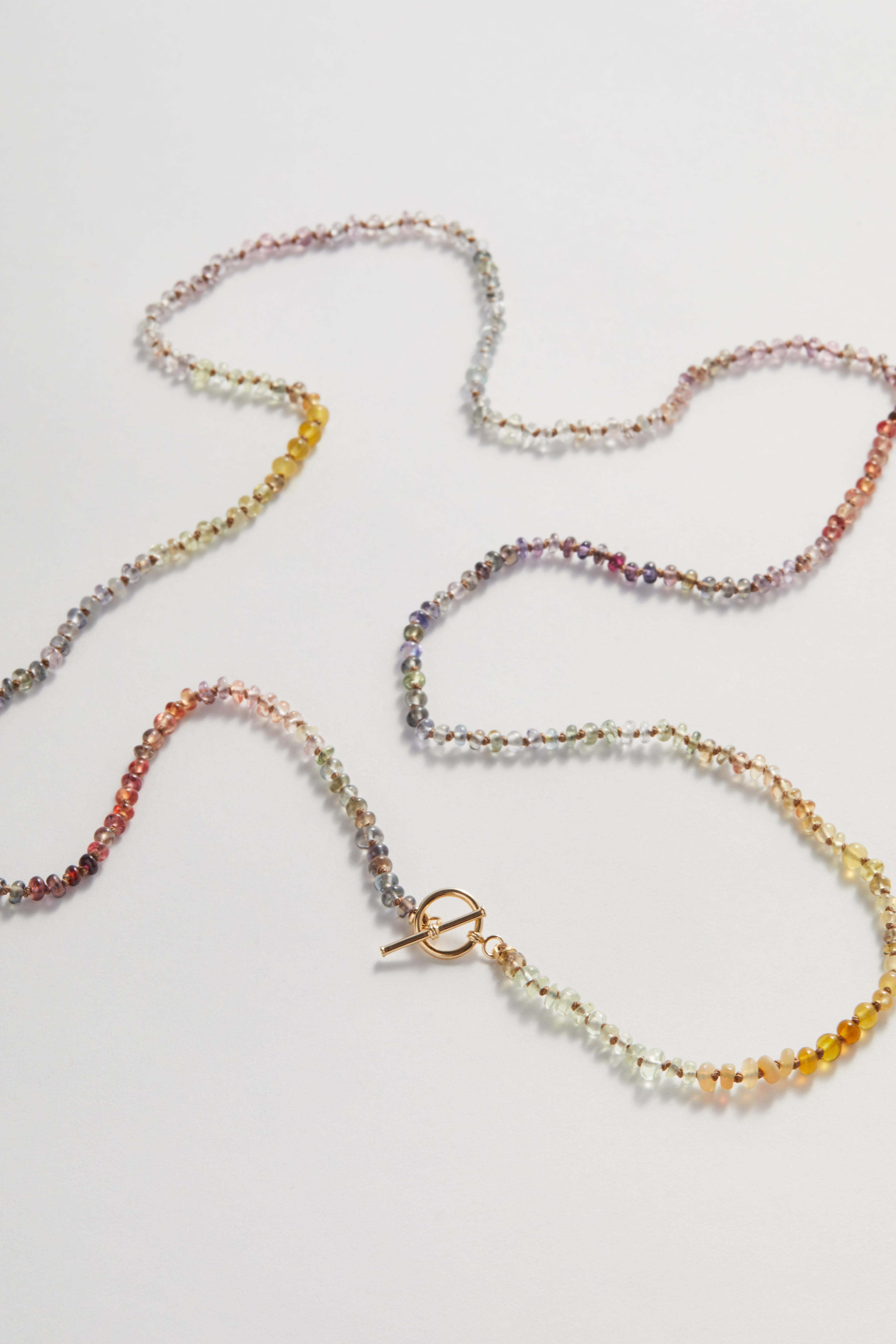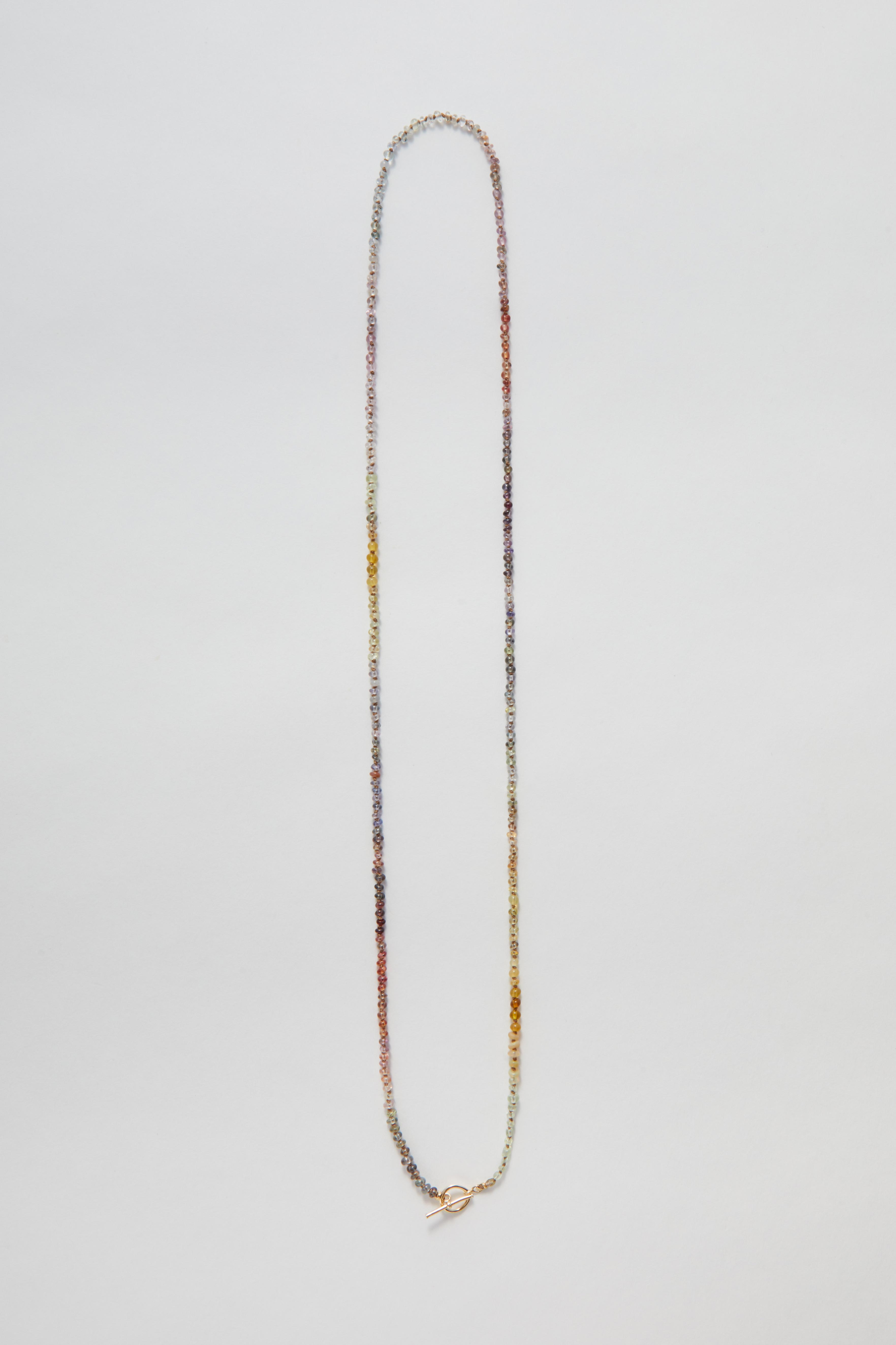 This long sapphire necklace is composed of smooth, softly toned sapphires arranged in a natural, earthy spectrum. Muted greys, mossy greens, warm browns and inky blues move gently along the strand, creating an Appalachian-inspired colour story.