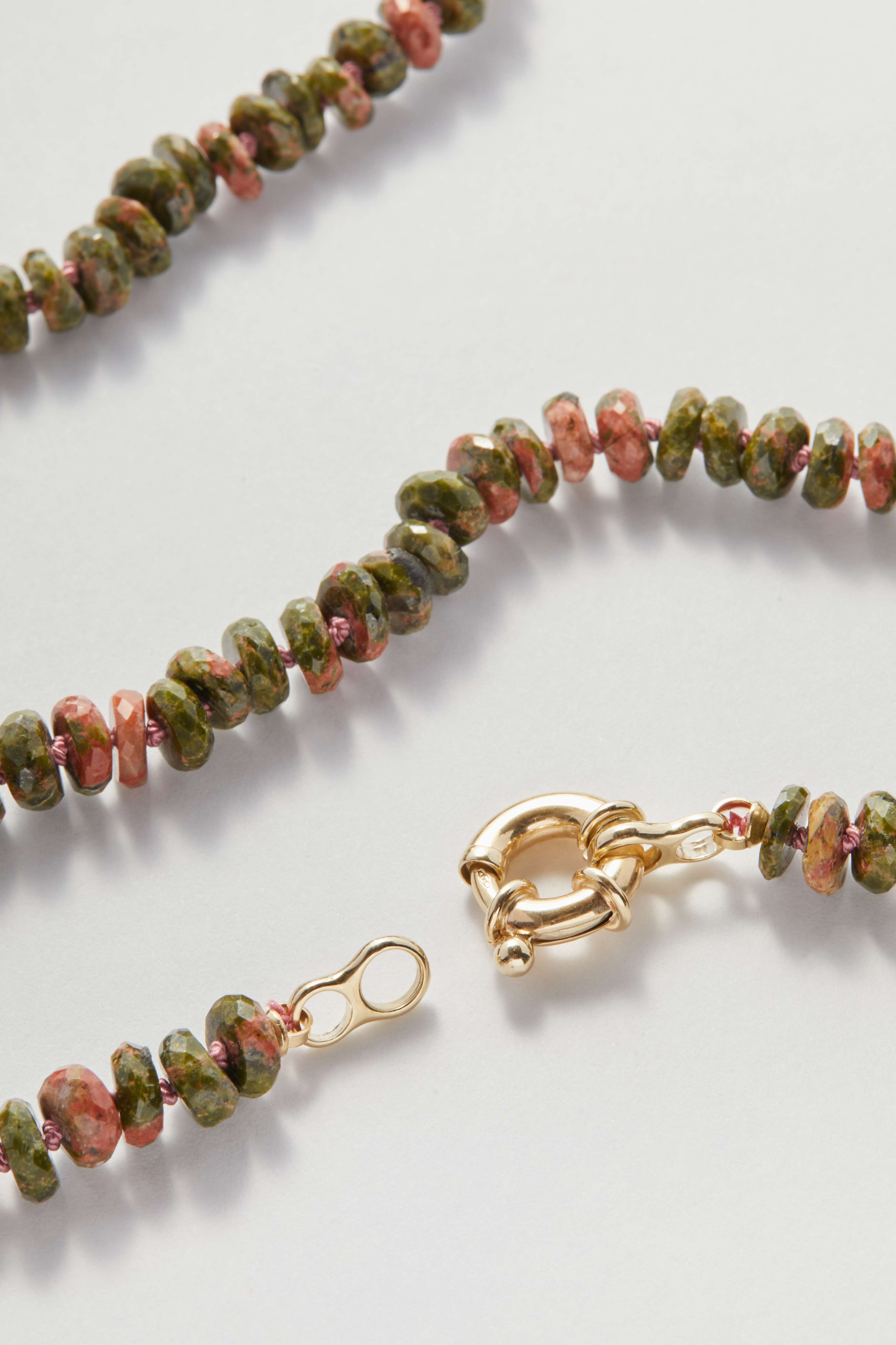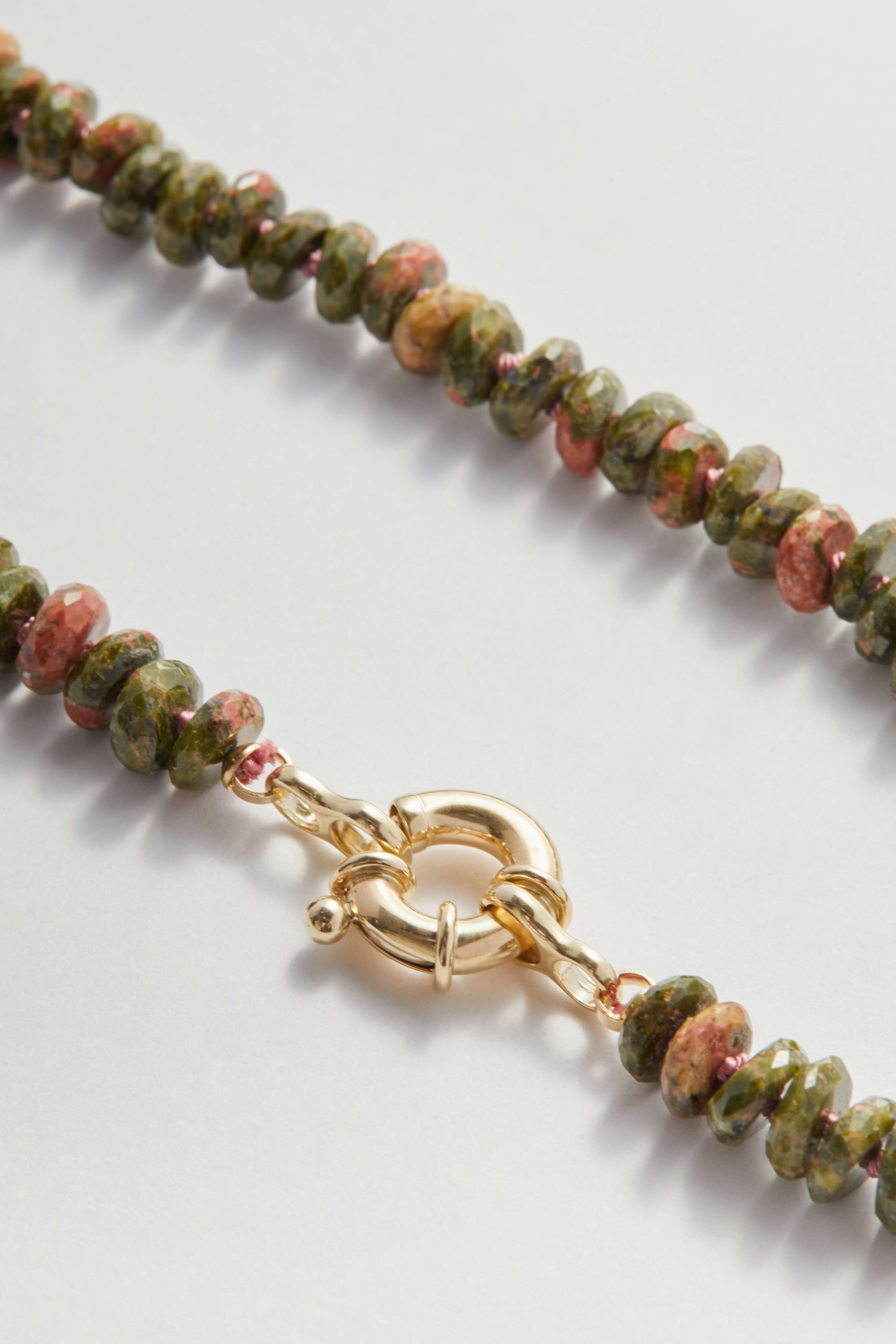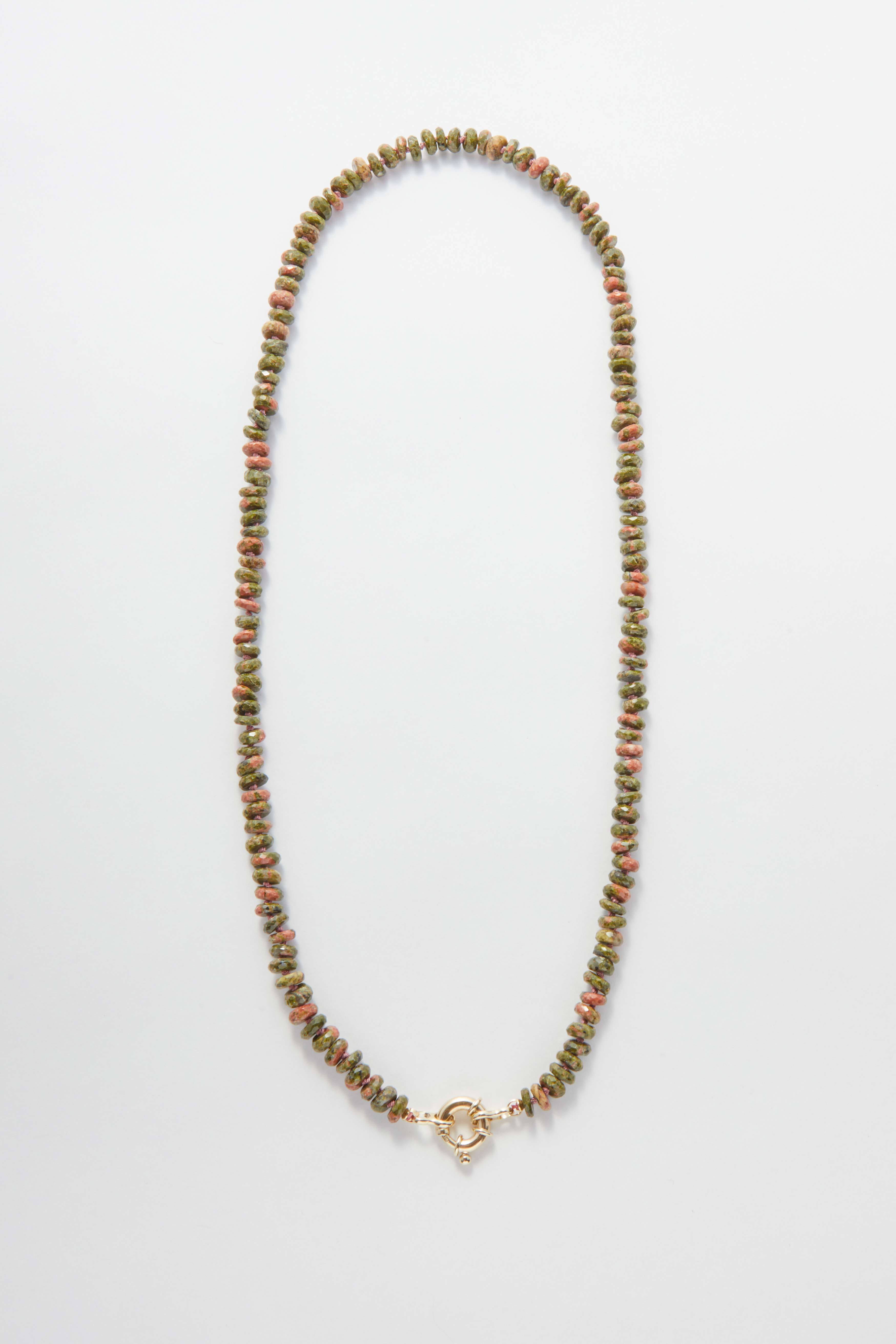 This necklace is crafted from faceted unakite gemstones, chosen for their earthy blend of mossy greens and soft clay-pink tones. The colour feels grounded and natural - subtle, warm and easy to wear.