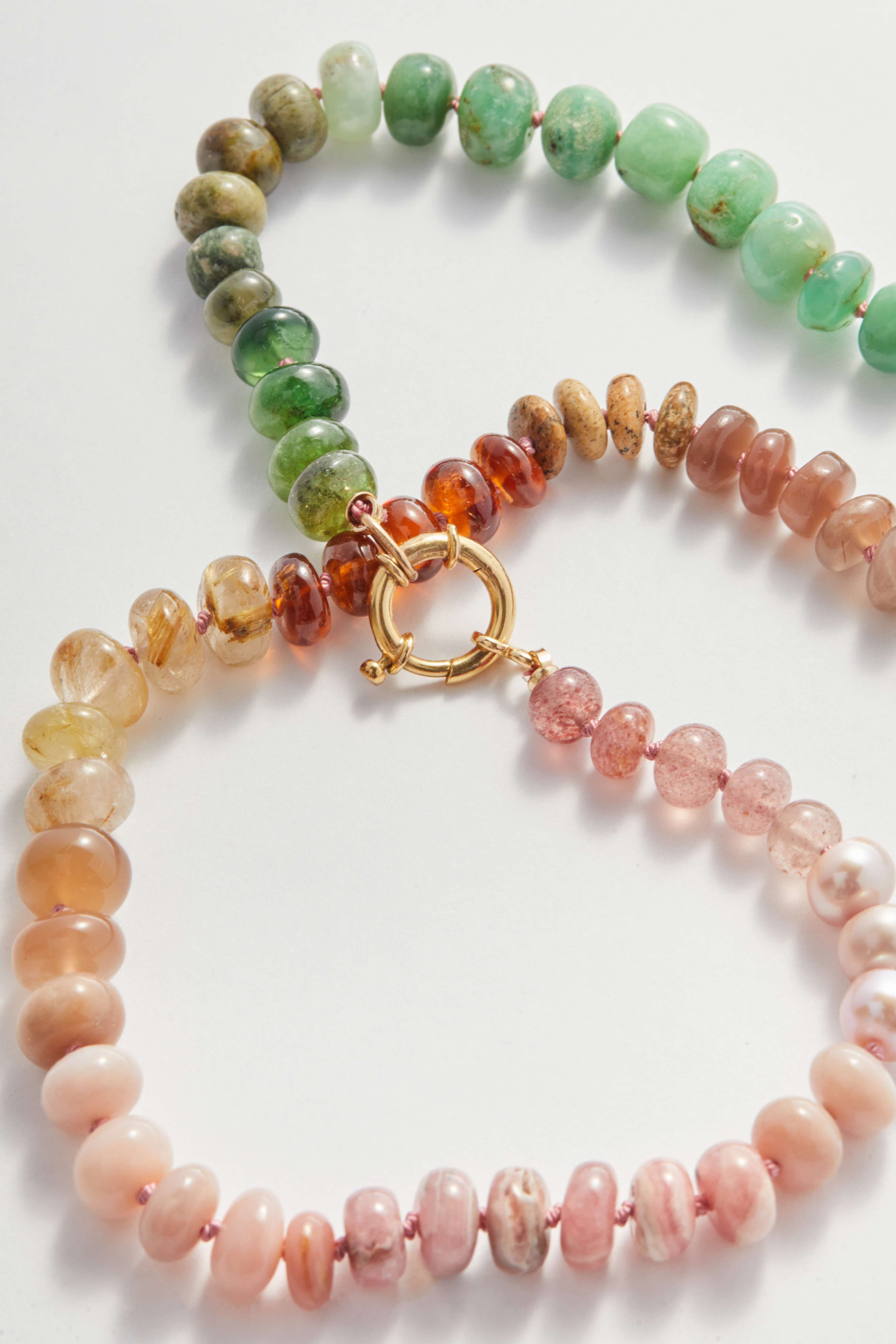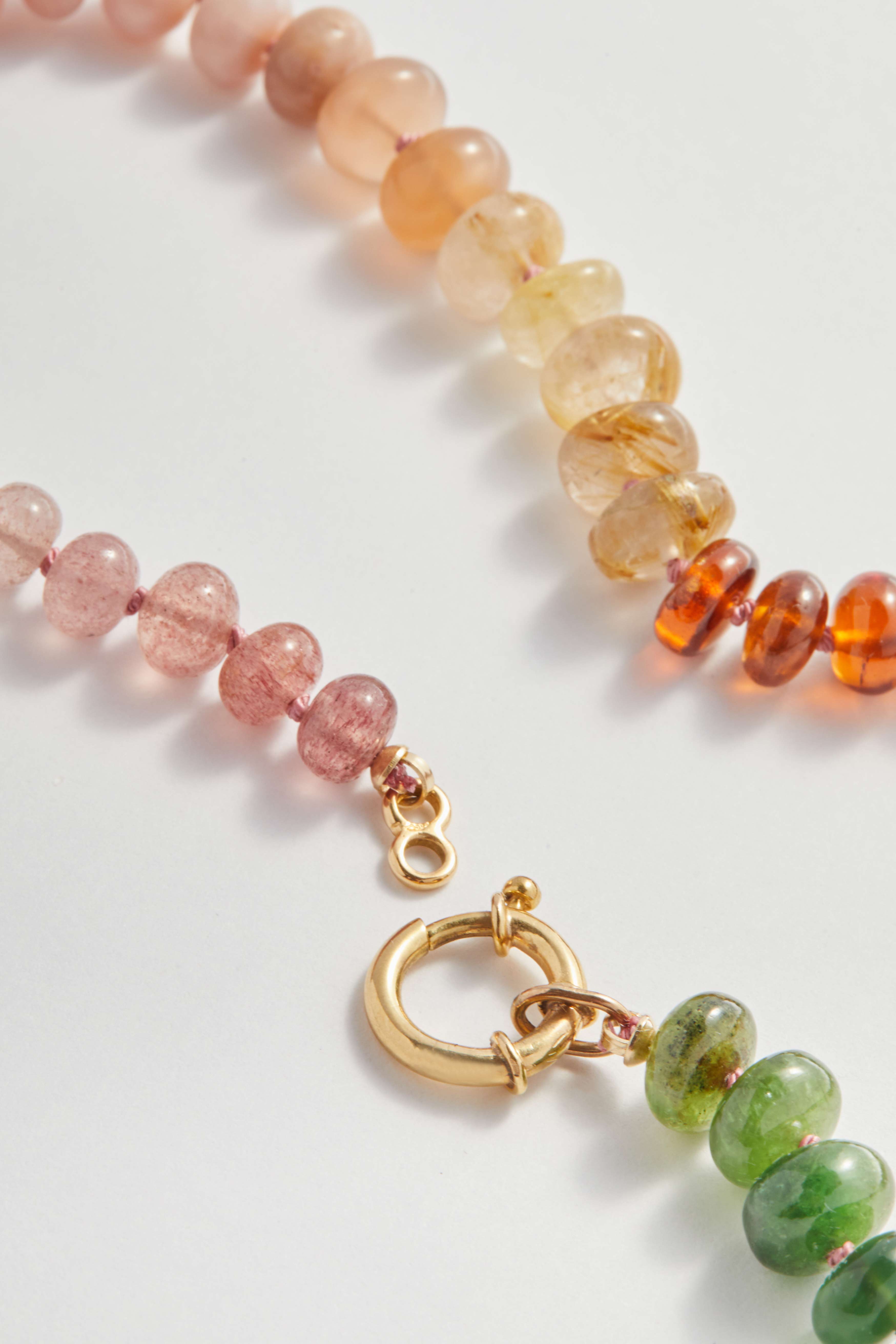 Each gemstone is individually hand-knotted onto silk thread, allowing the necklace to drape beautifully while protecting every stone. Subtle shifts in tone, translucency and texture give the piece its character — no two sections are ever quite the same, and that natural variation is very much part of its charm.