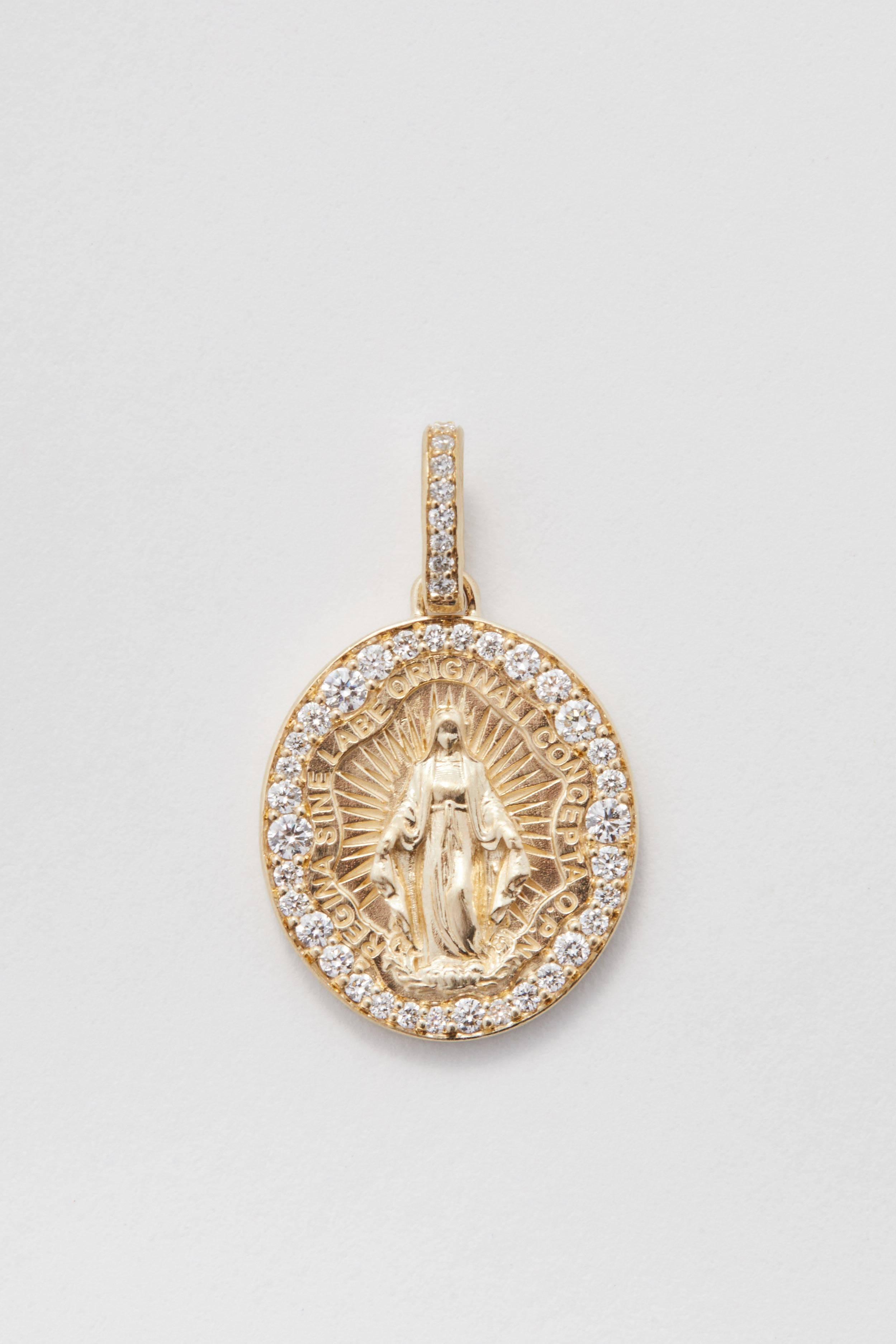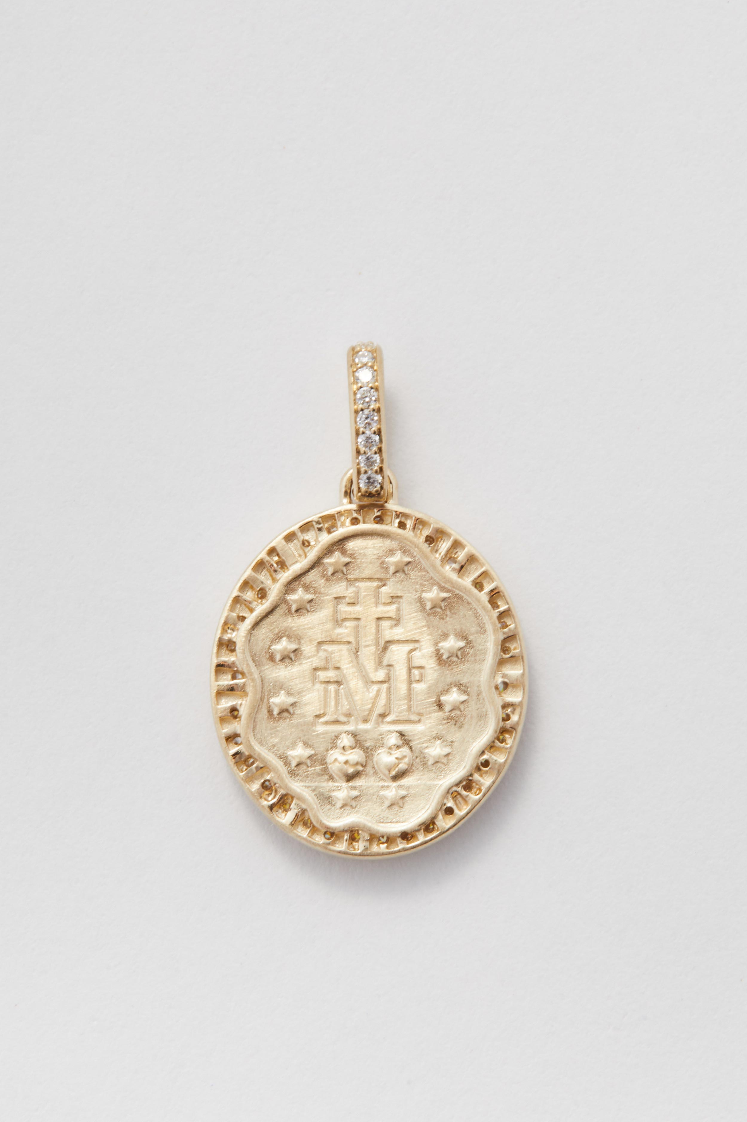 Designed in London, this is a medal of gentle contrasts. The 9k recycled gold is given a soft, matte finish, like a story worn smooth with retelling. Around the Madonna, a scattering of lab-grown diamonds are set, catching the light like little sparks of memory. Each detail is brought to life by our artisans in Thailand, creating not just a piece of jewellery, but a small, solid piece of a story, ready to be passed on.
