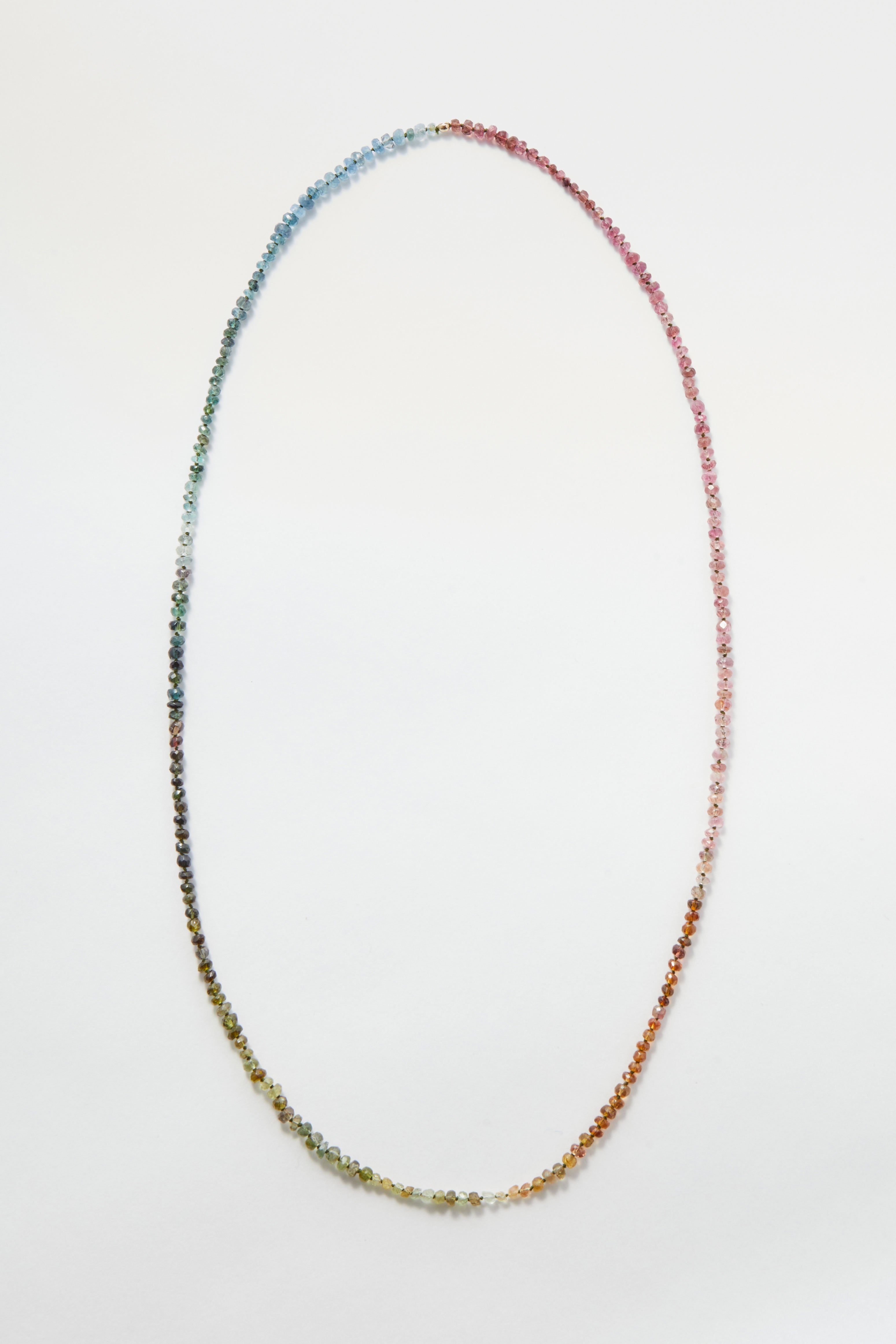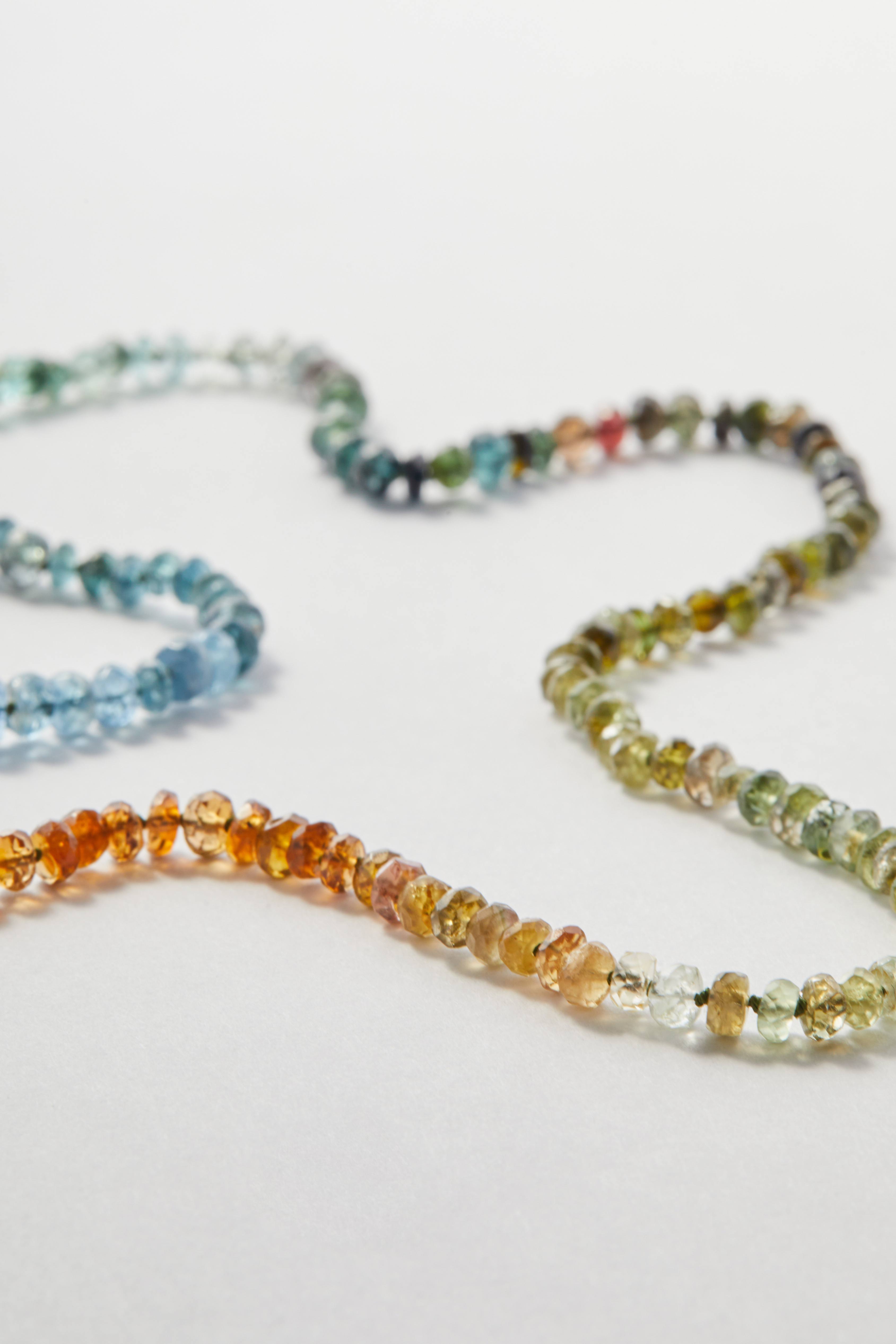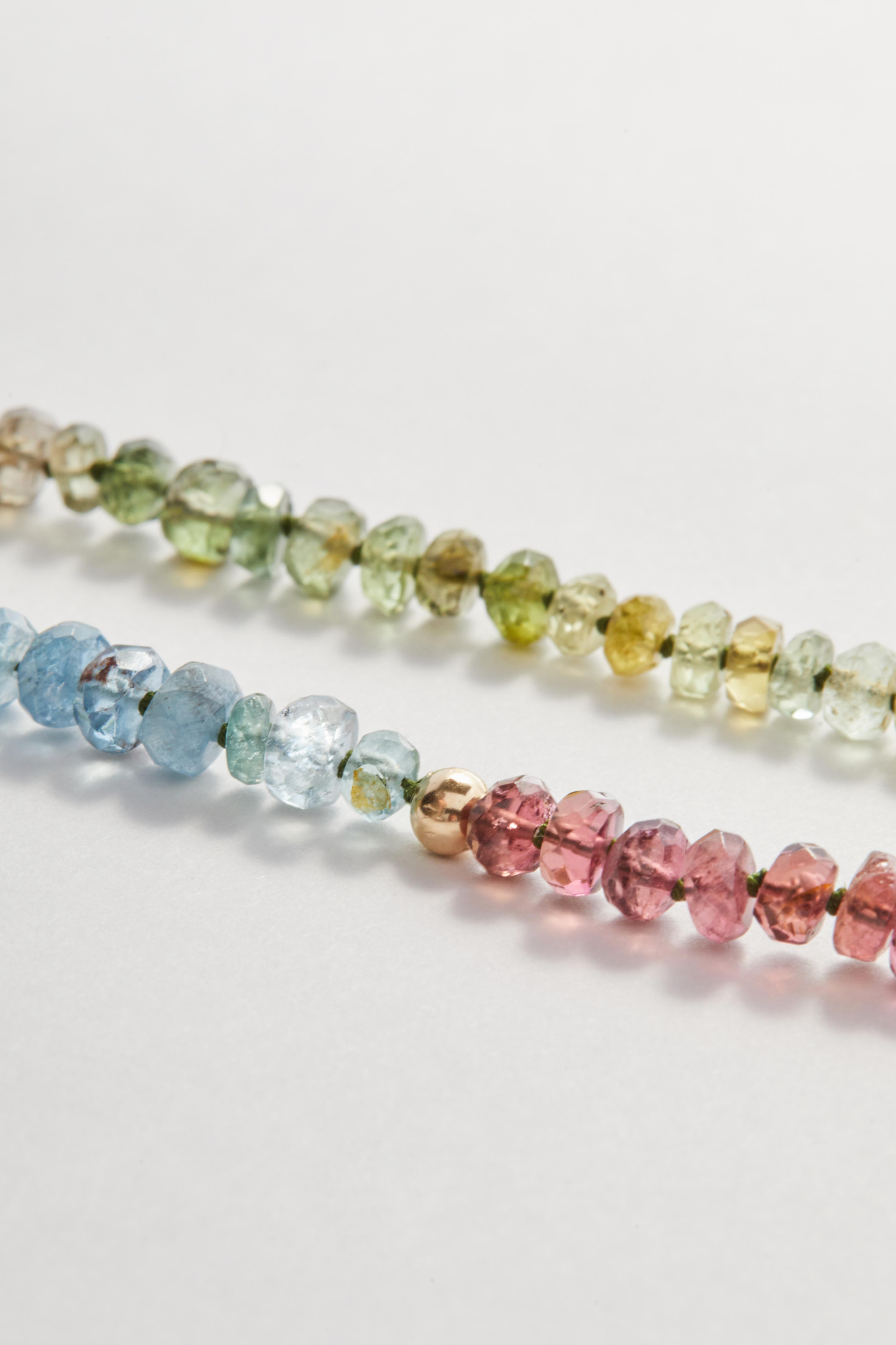 This delicate pullover necklace is crafted from a mix of tourmaline and aquamarine gemstones, chosen for their gentle shifts in colour and natural clarity. Soft blues, watery greens and warm, earthy tones sit together effortlessly, creating a piece that feels both calm and warm.