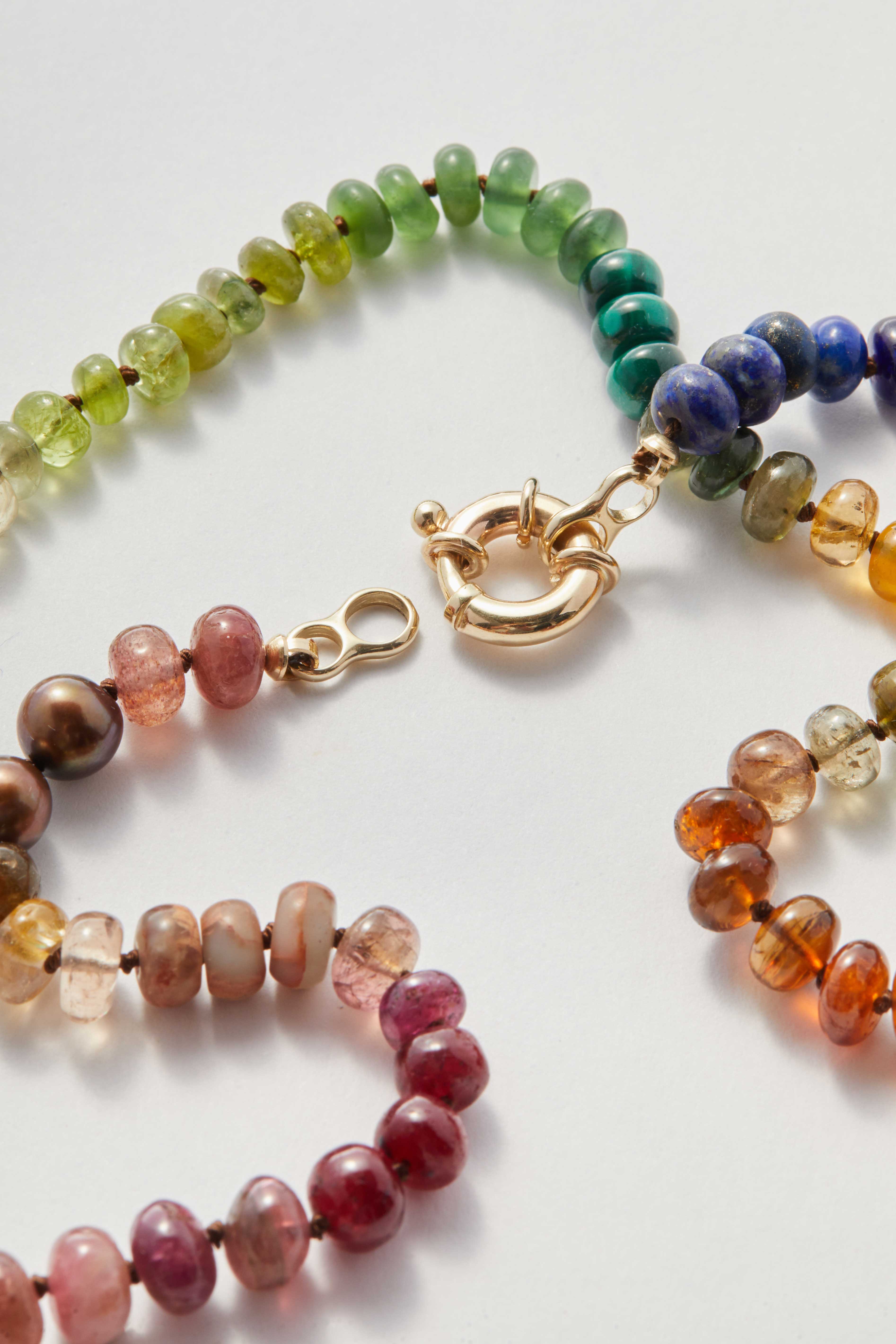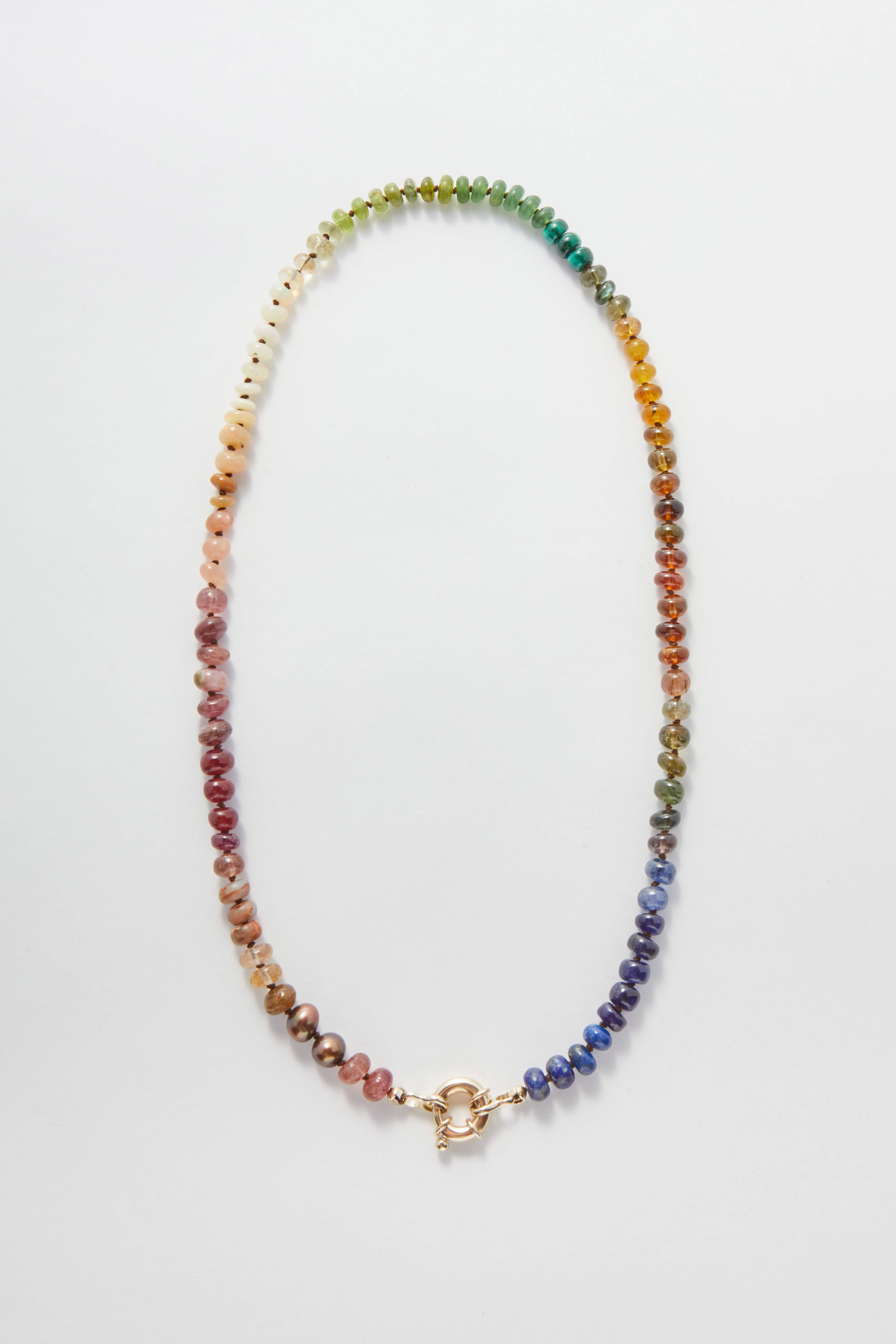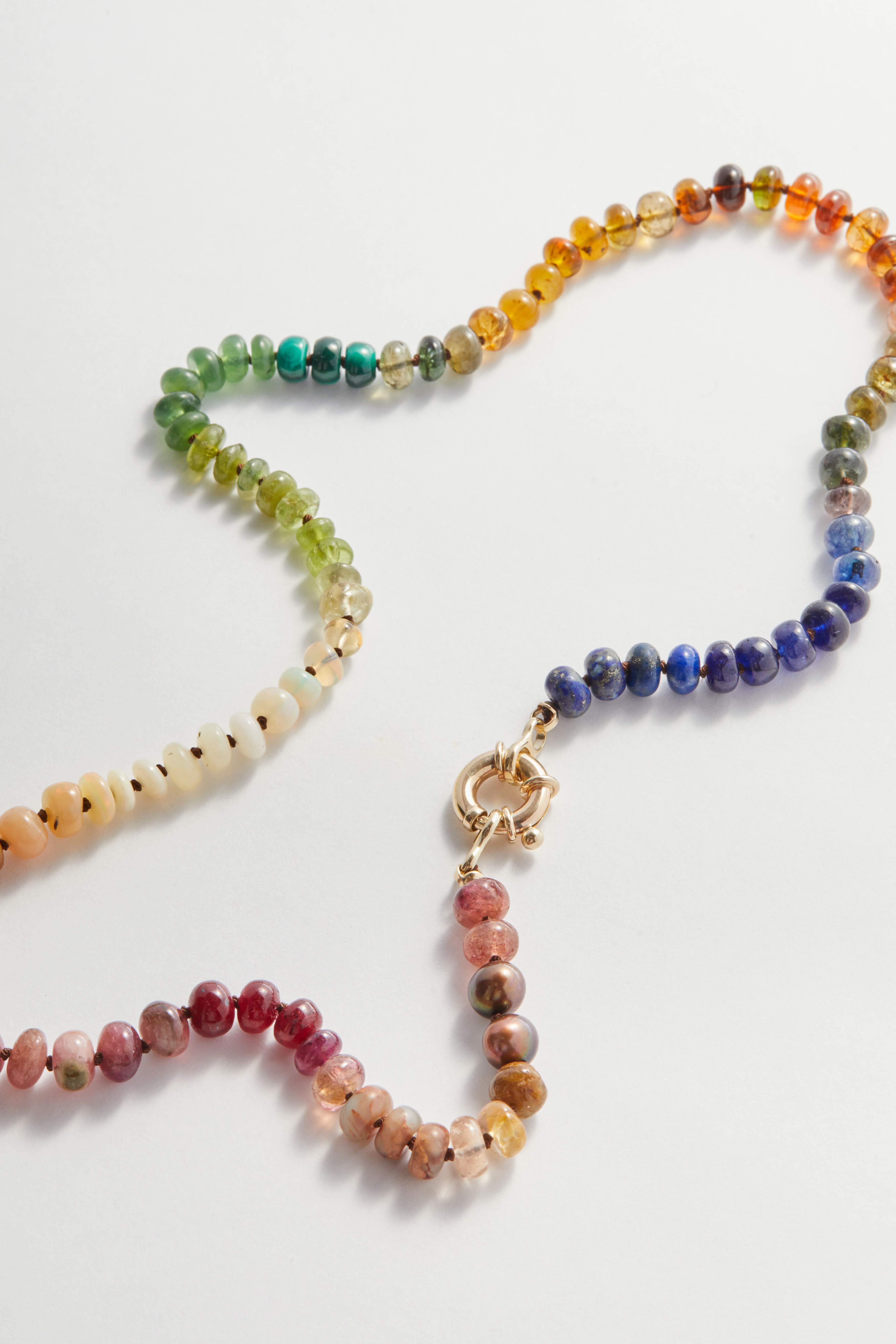 Each gemstone is individually hand-knotted onto silk thread, allowing the necklace to drape fluidly against the skin while protecting each stone. The subtle shifts in colour, translucency and texture give the piece its character - a rainbow that feels instinctive rather than arranged.