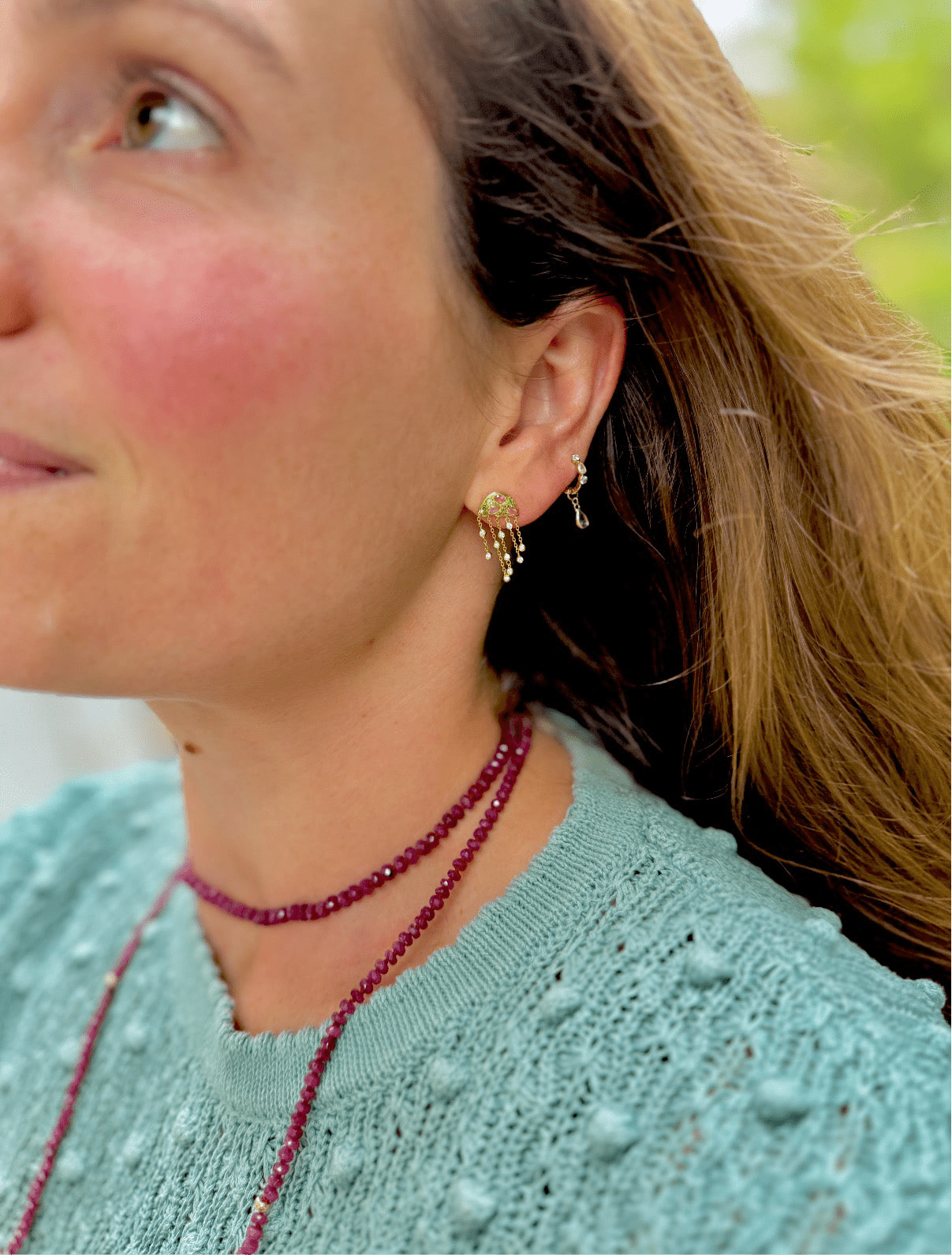 It’s a whimsical nod to the sea – fluid, detailed, and full of character. Designed to be light on the ear, it moves with you, its delicate chains and hand-set stones catching the eye from every angle. A reminder to find magic in the drift of the everyday.